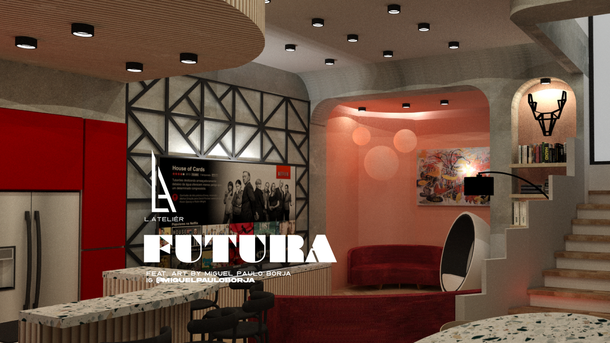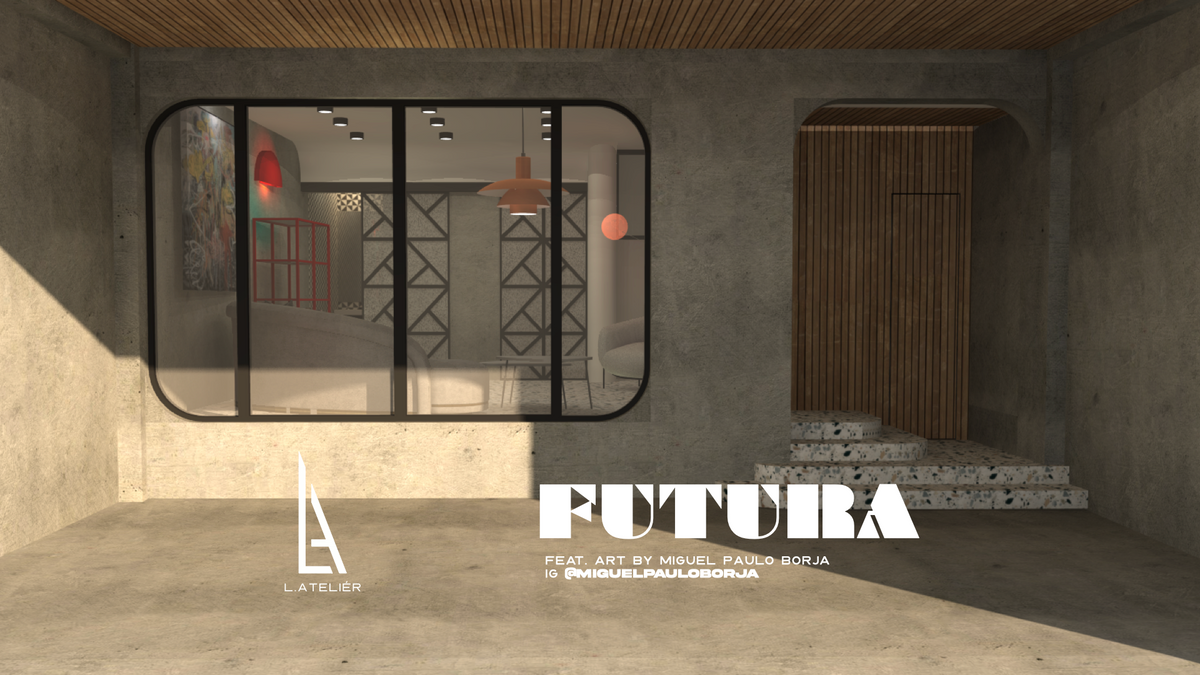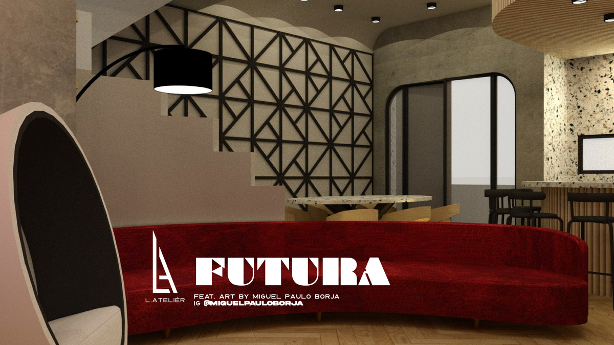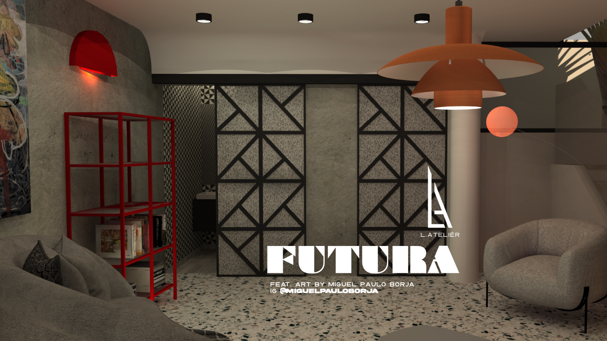 Futura blends 80’s retro-futurism with today’s sleek design and advanced materials. Beton brut walls, terrazzo countertops, and bold geometric shapes create a warm yet futuristic vibe.