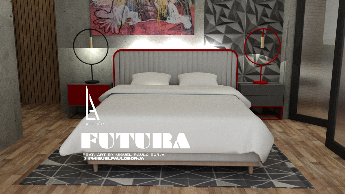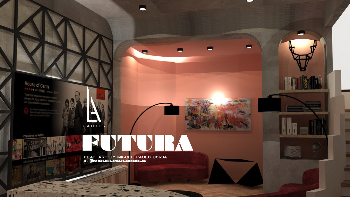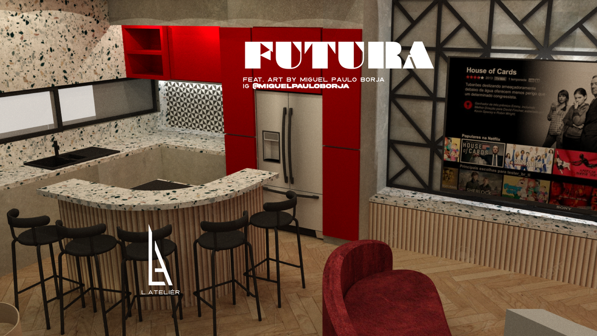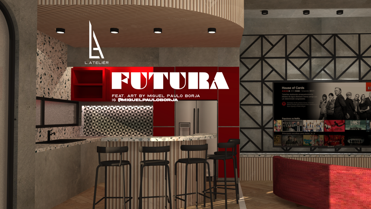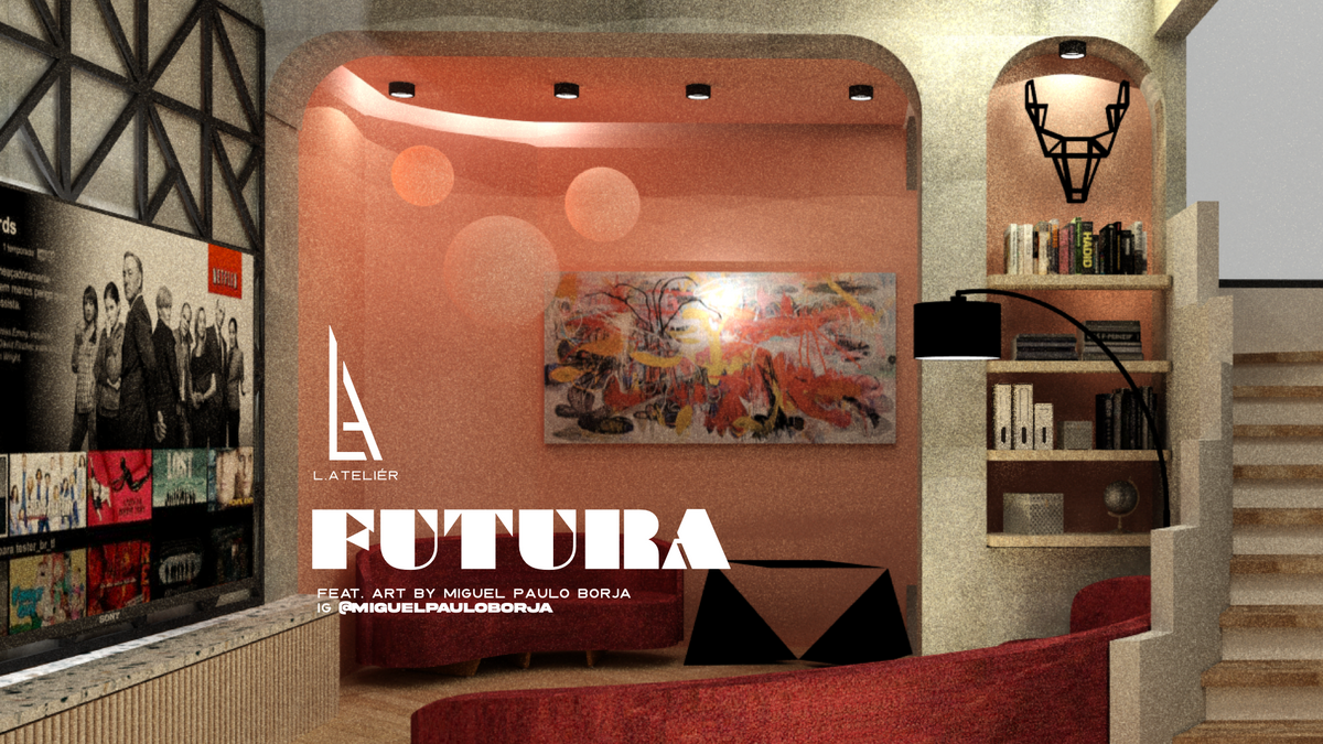 Futura blends 80’s retro-futurism with today’s sleek design and advanced materials. Beton brut walls, terrazzo countertops, and bold geometric shapes create a warm yet futuristic vibe.